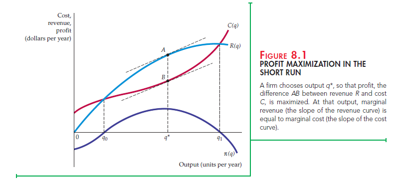 For the firm illustrated in Figure 8.1, profit is negative at low levels of output because revenue is insufficient to cover fixed and variable costs. As output increases, revenue rises more rapidly than cost, so that profit eventually becomes positive. Profit continues to increase until output reaches the level q*. At this point, marginal revenue and marginal cost are equal, and the vertical distance between revenue and cost, AB, is greatest. q* is the profit-maximizing output level. Note that at output levels above q*, cost rises more rapidly than revenue— i.e., marginal revenue is less than marginal cost. Thus, profit declines from its maximum when output increases above q*.