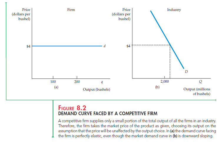 Because it is a price taker, the demand curve d facing an individual competitive firm is given by a horizontal line. In Figure 8.2(a), the farmer ’s demand curve cor- responds to a price of $4 per bushel of wheat. The horizontal axis measures the amount of wheat that the farmer can sell, and the vertical axis measures the price.
