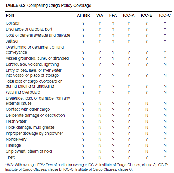 The policies described (all-risks, with average, free of particular average) are mostly written by U.S.-based insurance companies. A similar set of standard terms (Institute of Cargo Clauses or ICC Clauses) are used by Lloyd’s insurers and insurers that are members of the Institute of London underwriters (most of the U.K. insurance market). The A clauses in the ICC are equivalent to all-risks clauses, while the B and C clauses are equivalent to with average and free of particular average clauses, respectively (Table 6.2).