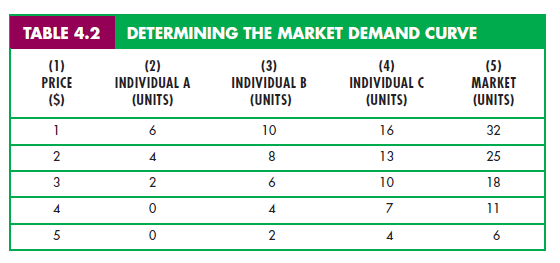 To keep things simple, let’s assume that only three consumers (A, B, and C) are in the market for coffee. Table 4.2 tabulates several points on each consumer ’s demand curve. The market demand, column (5), is found by adding columns (2), (3), and (4), representing our three consumers, to determine the total quan- tity demanded at every price. When the price is $3, for example, the total quan- tity demanded is 2 + 6 + 10, or 18.