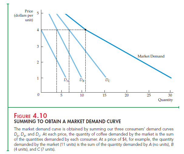Figure 4.10 shows these same three consumers’ demand curves for coffee (labeled DA, DB, and DC). In the graph, the market demand curve is the horizon- tal summation of the demands of each consumer. We sum horizontally to find the total amount that the three consumers will demand at any given price. For