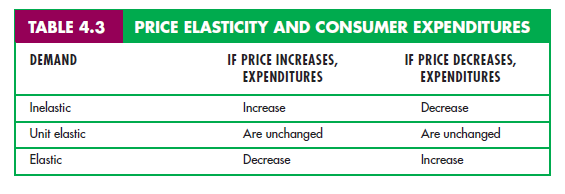 Table 4.3 summarizes the relationship between elasticity and expenditure. It is useful to review this table from the perspective of the seller of the good rather