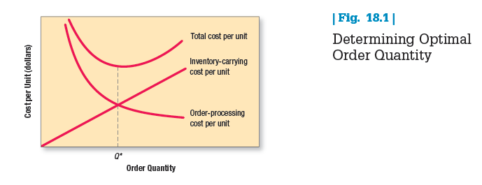 We can determine the optimal order quantity by observing how order-processing costs and inventory-carrying costs add up at different order levels. Figure 18.1 shows that the order-processing cost per unit decreases as the number of units ordered increases because the order costs are spread over more units. Inventory-carrying charges per unit increase with the number of units ordered because each unit remains longer in inventory. We sum the two cost curves vertically into a total-cost curve and project the lowest point of the total-cost curve on the horizontal axis to find the optimal order quantity Q .74