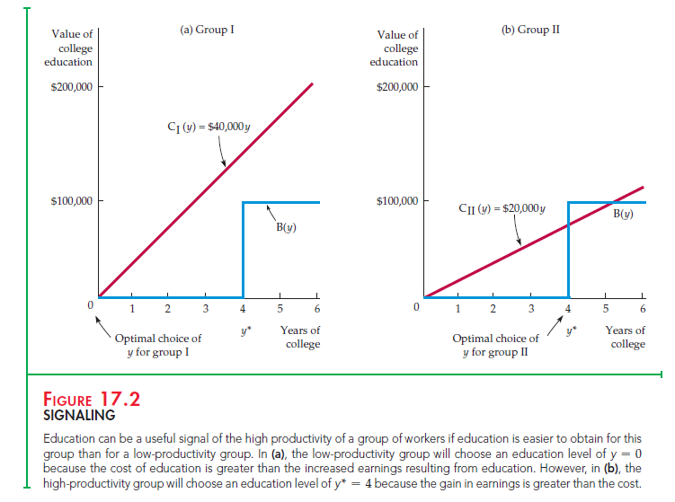 Now suppose (to keep things simple and to dramatize the importance of signaling) that education does nothing to increase one’s productivity; its only value is as a signal. Let’s see if we can find a market equilibrium in which different people obtain different levels of education, and in which firms look at education as a signal of productivity.