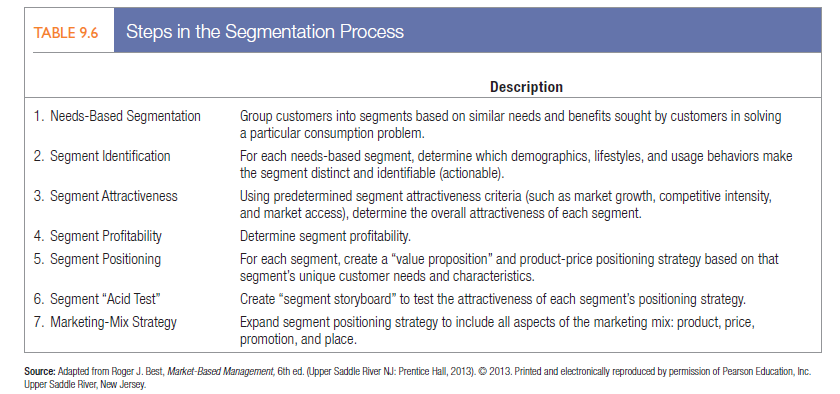 There are many statistical techniques for developing market segments.65 Once the firm has identified its market- segment opportunities, it must decide how many and which ones to target. Marketers are increasingly combining several variables in an effort to identify smaller, better-defined target groups. Thus, a bank may not only identify a group of wealthy retired adults but within that group distinguish several segments depending on current income, assets, savings, and risk preferences. This has led some market researchers to advocate a needs-based market segmentation approach. Roger Best proposed the seven-step approach shown in Table 9.6.