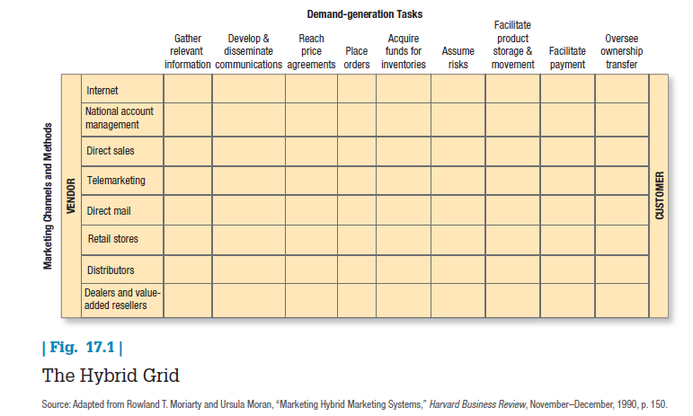 There is a trade-off, however. New channels typically introduce conflict and problems with control and cooperation. Two or more may end up competing for the same customers.12 Clearly, companies need to think through their channel architecture and determine which channels should perform which functions.13 Figure 17.1 shows a simple grid to help make channel architecture decisions. It consists of major marketing channels (as rows) and the major channel tasks to be completed (as columns).14