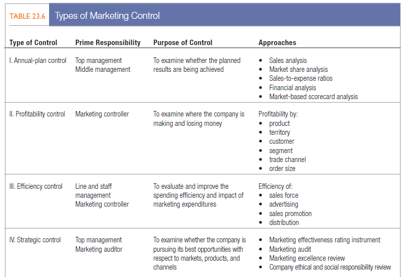 Marketing control is the process by which firms assess the effects of their marketing activities and programs and make necessary changes and adjustments. Table 23.6 lists four types of needed marketing control: annual-plan control, profitability control, efficiency control, and strategic control.