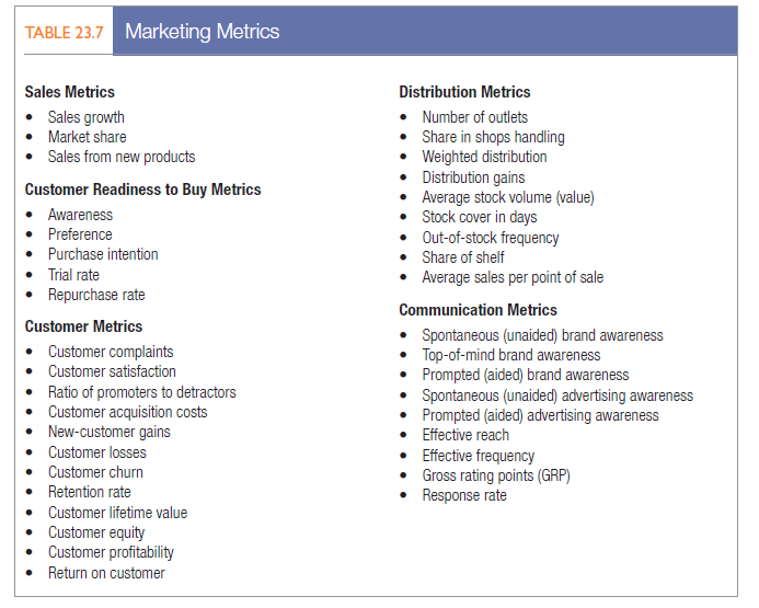 This control model applies to all levels of the organization. Top management sets annual sales and profit goals; each product manager, regional district manager, sales manager, and sales rep is committed to attaining specified levels of sales and costs. Each period, top management reviews and interprets the results. Marketers today have better marketing metrics for measuring the performance of marketing plans (see Table 23.7 for some samples).73 Four tools for the purpose are sales analysis, market share analysis, marketing expense-to-sales analysis, and financial analysis. The chapter appendix outlines them in detail.