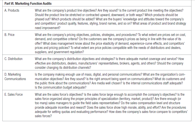 The marketing audit examines six major components of the company’s marketing situation. Table 23.8 lists the major questions.