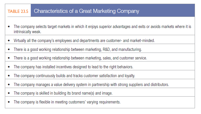 Table 23.5 summarizes the characteristics of a great marketing company, great not for what it is but for what it does. Great marketing companies know the best marketers thoughtfully and creatively devise marketing plans and then bring them to life. Marketing implementation and control are critical to making sure marketing plans have their intended results year after year.