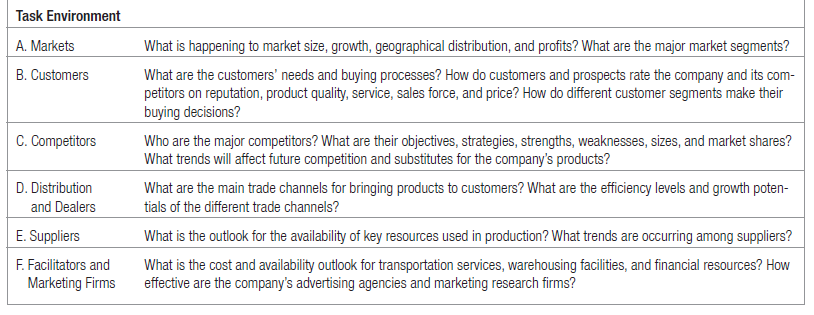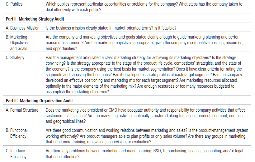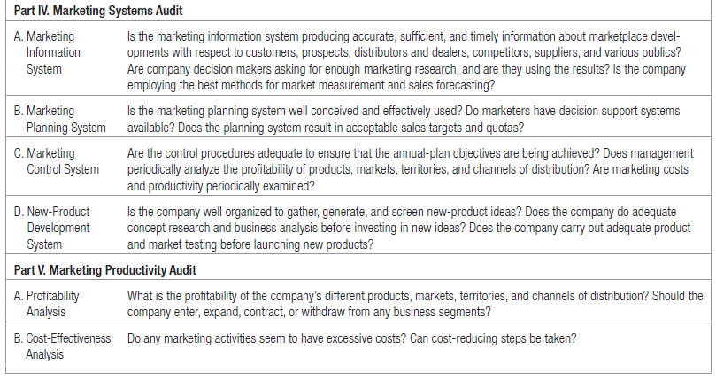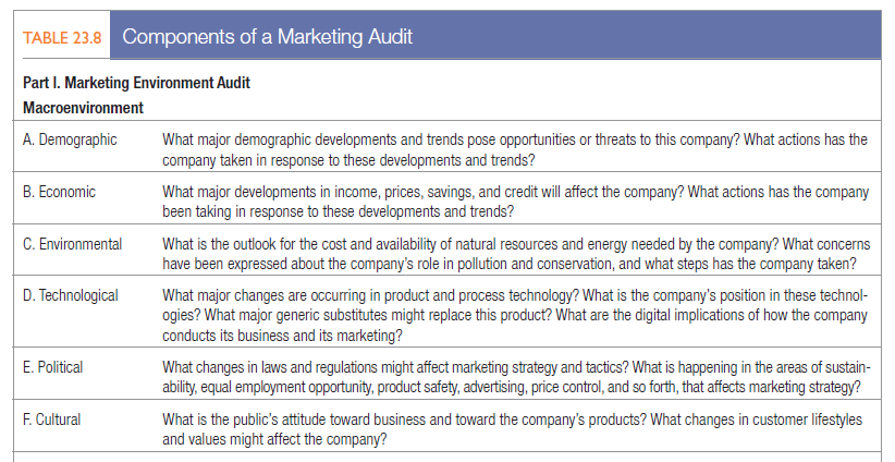 The marketing audit examines six major components of the company’s marketing situation. Table 23.8 lists the major questions.