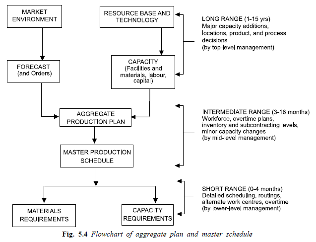 Flowchart of aggregate plan and master production schedule is shown in Fig. 5.4 Time interval used in master scheduling depends upon the type, volume, and component lead times of the products being produced. Normally weekly time intervals are used. The time horizon covered by the master schedule also depends upon product characteristics and lead times. Some master schedules cover a period as short as few weeks and for some products it is more than a year.