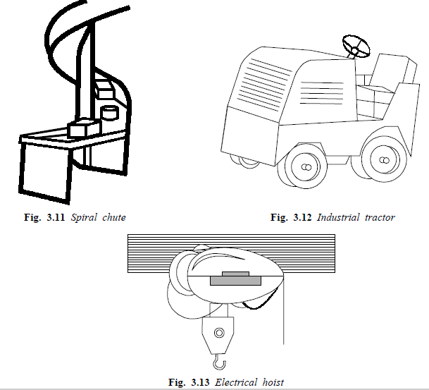 The choice of material-handling equipment among the various possibilities that exist is not easy. In several cases the same material may be handled by various types of equipments, and the great diversity of equipment and attachments available does not make the problem any easier. In several cases, however, the nature of the material to be handled narrows the choice. Some of the material handling equipment are shown in Figs. 3.1 to 3.11.