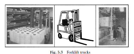 Forklift trucks are the work horse of the warehouse, most commonly used for movement of unit loads such as pallets, containers and slide plates. They are the most versatile material handling equipment used in the warehouse, also they are most reliable and relatively easy to operate (Figure 5.3). The forklift arms can go through the entry channels at the bottom of the pallet.
