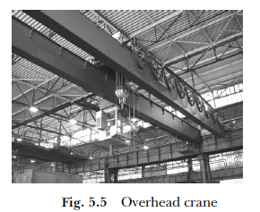 Overhead Cranes. Overhead cranes are used for moving very heavy items over a short distance. Items such as steel plates, bars, coils, tubes or machinery components can be efficiently handled with overhead cranes. These cranes have the moving and lifting mechanism installed on the fixed girders at the roof of the building. Lifting mechanism is called as saddle or hoist, which moves on rails across the bay and saddle can be moved throughout the length of the bay (Figure 5.5).