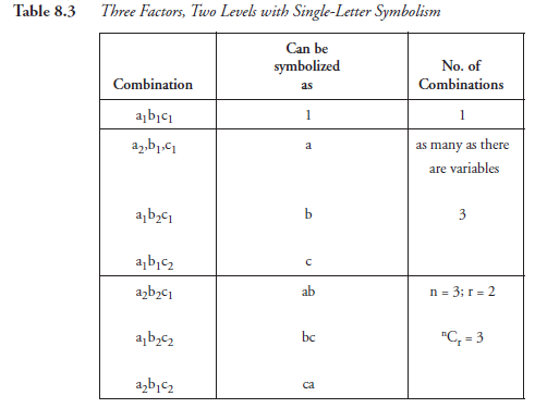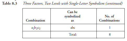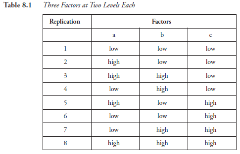 - When only two levels of factors are involved, the words “high” and “low” can be used to represent any number of factors. Thus, the eight combina- tions we dealt with earlier can be represented as they are in Table 8.1.