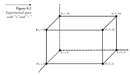 The situation of having three variables, each at two levels, can be represented pictorially, as shown in Figure 8.1. Each factor combination of the eight combinations we have dealt with as “designed factors” is represented by a vertex of the orthorhombic volume; the space represented by this shape is often referred to as the experimental space. If each factor has more than two levels, the experimental space can be extended, and the various factor combinations can be visually represented. If more than three factors are involved, however, then we need a space of more than three dimensions, which cannot be represented visually. That is the limitation of the experimental space. Statisticians have devised several other ways of compiling the factor combinations, which do not suffer such limitations; these are often referred to as matrices. The experiments involved are referred to as matrix-design experiments, also more popularly known as “factorial-design.”