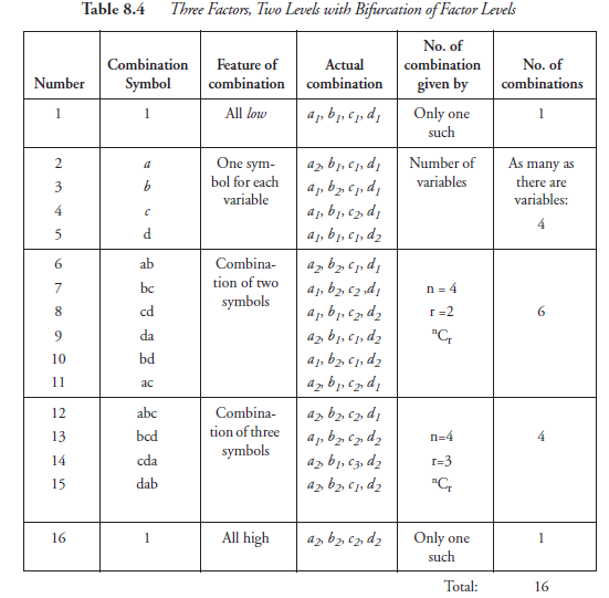 However, the reader should note that the case of four factors at two levels each cannot be represented graphically as an experimental space because it requires four dimensions; nonetheless, it can be expressed as a matrix. Further, the matrix method, on the same lines as shown in Table 8.4, can be used for five, six, indeed, any number of variables. It is also capable of providing the number of combinations under each category of one, two, three, or more symbols representing the combinations of variables. It is obvious that all these forms of matrices are suitable for situations wherein factors are tried at only two levels. Matrices suitable for three or more levels for each factor will be dealt with in Chapter 9.