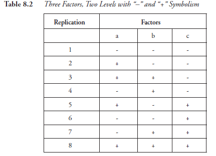 - When only two levels of factors are involved, the words “high” and “low” can be used to represent any number of factors. Thus, the eight combina- tions we dealt with earlier can be represented as they are in Table 8.1.