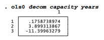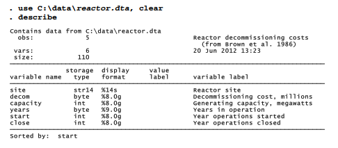 Dataset reactor.dta contains information about the decommissioning costs of five nuclear power plants that were shut down over 1968-1982. This example has the pedagogical advantage that its small matrices could be written easily on blackboard or paper, if desired (e.g., Hamilton 1992a:340). In any event, it invites the question of how decommissioning costs might be related to reactor capacity and years of operation.