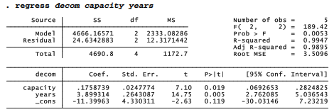 Performing OLS regression with Stata is very easy, of course. We find that decommissioning costs among these five reactors increased by about .176 million dollars ($175,874) with each megawatt of generating capacity, and by about 3.9 million dollars with each year of operation. The two predictors explain almost 99% of the variance in decommissioning costs (R2a = .9895).