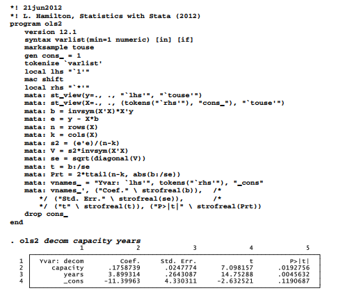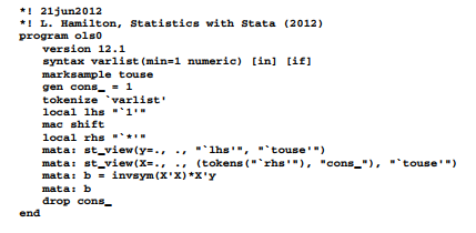 The ado-file below defines program ols0 using Mata commands. It simply calculates the vector of regression coefficients b. Mata commands start with mata: in this example. (Several other ways to use these commands interactively or in programs are described in the manuals.) The first two mata: commands define vector y and matrix X as “views” of the data in memory, specified by whatever left-hand-side (lhs) and right-hand-side (rhs) variables appeared in the ols0 command line. A constant, 1, forms the last column of matrix X. ols0 permits in or if qualifiers, or missing values. The estimating equation