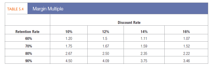Table 5.4 shows the margin multiple for various combinations of r and i and a simple way to estimate CLV of a customer. When retention rate is 80 percent and discount rate is 12 percent, the margin multiple is about two and a half. Therefore, the future CLV of an existing customer in this scenario is simply his or her annual margin multiplied by 2.5.