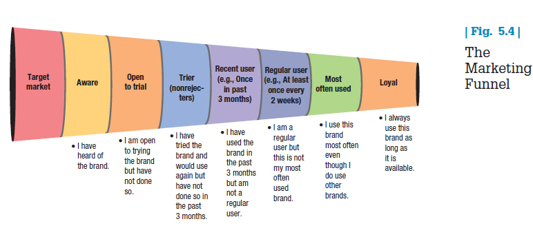 RETENTION DYNAMICS Figure 5.4 shows the main steps in attracting and retaining customers, imagined in terms of a funnel, and some sample questions to measure customer progress through the funnel. The marketing funnel identifies the percentage of the potential target market at each stage in the decision process, from merely aware to highly loyal. Consumers must move through each stage before becoming loyal customers. Some marketers extend the funnel to include loyal customers who are brand advocates or even partners with the firm.