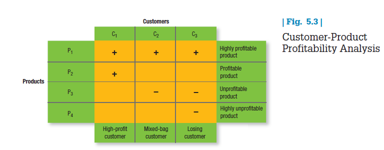 CUSTOMER PROFITABILITY ANALYSIS A useful type of profitability analysis is shown in Figure 5.3.33 Customers are arrayed along the columns and products along the rows. Each cell contains a symbol representing the profitability of selling that product to that customer. Customer 1 is very profitable; he buys two profit-making products (P1 and P2). Customer 2 yields mixed profitability; she buys one profitable product (P1) and one unprofitable product (P3). Customer 3 is a losing customer because he buys one profitable product (P1) and two unprofitable products (P3 and P4).