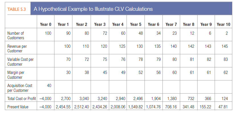 Gupta and Lehmann illustrate their approach by calculating the CLV of 100 customers over a 10-year period (see Table 5.3). In this example, the firm acquires 100 customers with an acquisition cost per customer of $40. Therefore, in year 0, it spends $4,000. Some of these customers defect each year. The present value of the profits from this cohort of customers over 10 years is $13,286.52. The net CLV (after deducting acquisition costs) is $9,286.52, or $92.87 per customer.