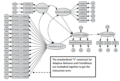 These standardized variables are now mean centered and rescaled.You will then use these Z score indicators to create interaction terms just like we did with the mean centered example. I have included an example of what the graphic depiction would look like in AMOS. Notice that the interaction terms are all reformed with the Z scores and all the labels have a Z at the front to denote a Z score interaction.