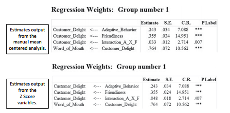 Comparison of the results shows a small difference in the unstandardized regression weights of the interaction variable.The t-value for the interaction is exactly the same across the differ- ent tests. The standardized regression weights are also exactly the same across the two tests. Any differences that are present across the two moderation tests is a result of rescaling the data with the Z scores and rounding considerations with the mean centered option.The results are essentially equivalent.