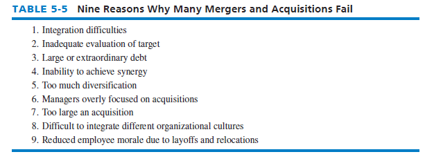 Merger and acquisition are two commonly used ways to pursue strategies. A merger occurs when two organizations of about equal size unite to form one enterprise. An acquisition occurs when a large organization purchases (acquires) a smaller firm or vice versa. If a merger or acquisition is not desired by both parties, it is called a hostile takeover, as opposed to a friendly merger. Most mergers are friendly, but the number of hostile takeovers is on the rise. Not all mergers are effective and successful. For example, soon after Halliburton acquired Baker Hughes, Halliburton’s stock price declined 11 percent. So, a merger between two firms can yield great benefits, but the price and reasoning must be right. Some key reasons why many mergers and acquisitions fail are provided in Table 5-5.