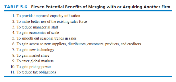 However, the U.S. Treasury Department’s new rules cracking down on tax inversions, where a company acquires a foreign company in order to avoid paying federal taxes, will likely somewhat curtail the number of mergers and acquisitions going forward. More than 10,000 mergers transpire annually in the United States, with same-industry combinations predominating. A general market consolidation is occurring in many industries, especially energy, banking, insurance, defense, and health care, but also in pharmaceuticals, food, airlines, accounting, publishing, computers, retailing, financial services, and biotechnology. Table 5-6 presents the potential benefits of merging with or acquiring another firm.