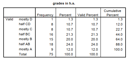 - Analyze → Descriptive Statistics → Frequencies → move grades in h.s. to the Variable(s): box → OK.