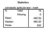 - Analyze → Descriptive Statistics → Frequencies → move scholastic aptitude test – math → Statistics → Mean, Median, and Mode → Continue → OK.