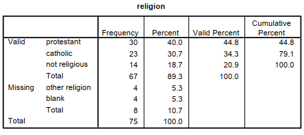 - Analyze → Descriptive Statistics → Frequencies → move religion to the Variable(s): box → OK (make sure that the Display frequency tables box is checked.