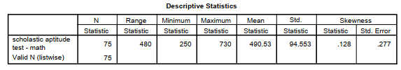 - Analyze → Descriptives Statistics → Descriptive → move scholastic aptitude test – math → Options → Mean, Std Deviation, Range, Minimum, Maximum, and Skewness → Continue → OK.