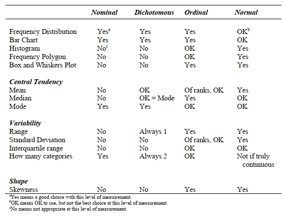 Table 3.3 summarizes much of the previous information about the appropriate use of various kinds of descriptive statistics given nominal, dichotomous, ordinal, or normal data.