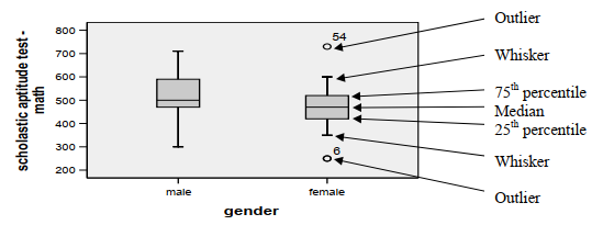 - Analyze → Descriptive Statistics→ Explore → scholastic aptitude test – math to Dependent List box → gender to Factor List → under Display select Plots → OK