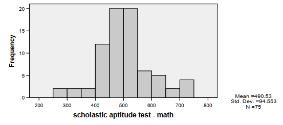 When the variable is continuous or has many ordered levels (or values), the frequency distribution usually is based on ranges of values for the variable. For example, the frequencies (number of students), shown by the bars in Fig 3.1, are for a range of points. (In this case the program selected a range of 50: 250-299, 300-349, 350-399, etc.) Notice that the largest number of students (about 20) had scores in the middle two bars of the range (450-499 and 500-549). Similar small numbers of students have very low and very high scores. The bars in the histogram form a distribution (pattern or curve) that is similar to the normal, bell-shaped curve. Thus, the frequency distribution of the SAT math scores is said to be approximately normal.