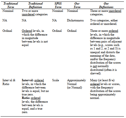 We believe that the terms nominal, dichotomous, ordinal, and approximately normal (for normally distributed) are usually more useful than the traditional or SPSS measurement terms for the selection and interpretation of statistics. In part, this is because statisticians disagree about the usefulness of the traditional levels of measurement in determining appropriate selection of statistics. Furthermore, our experience is that the traditional terms are frequently misunderstood and applied inappropriately by students. The main problem with the SPSS terms is that the term scale is not commonly used as a measurement level, and it has other meanings (see footnote 2) that make its use here confusing. Hopefully, our terms are clear and useful.