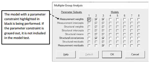 For many research studies, this is as far as you need to go. In some instances, further invari- ance testing is beneficial. There are three more potential tests for invariance that build off the metric invariance test.With each test, more and more constraints are added to the constraint model. These tests are run the same way as the metric invariance test, except they are listed as different models in AMOS.