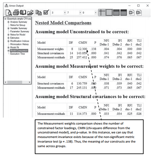 - Error variance invariance—this is the most restrictive model; it constrains factor loadings, covariance, variances in the construct, and also error terms of indicators. In AMOS, this is referred to as the “Measurement Residuals” model comparison. It is highly unlikely to get a non-significant finding with this test especially if you have a lot of indicators in your model