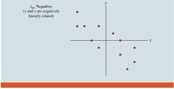 If the value of sxy is positive, the points with the greatest influence on sxy must be in quadrants I and III. Hence, a positive value for sxy indicates a positive linear association between x and y; that is, as the value of x increases, the value of y increases. If the value of sxy is negative, however, the points with the greatest influence on sxy are in quadrants II and IV. Hence, a negative value for sxy indicates a negative linear association between x and y; that is, as the value of x increases, the value of y decreases. Finally, if the points are evenly distributed across all four quadrants, the value of sxy will be close to zero, indicating no linear association between x and y. Figure 3.11 shows the values of sxy that can be expected with three different types of scatter diagrams.
