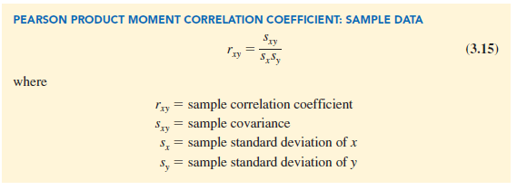Equation (3.15) shows that the Pearson product moment correlation coefficient for sample data (commonly referred to more simply as the sample correlation coefficient) is computed by dividing the sample covariance by the product of the sample standard deviation of x and the sample standard deviation of y.