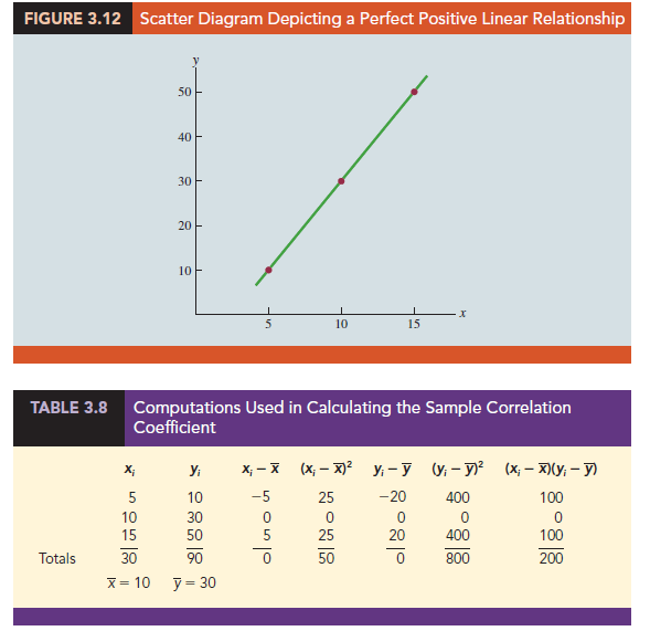 The straight line drawn through each of the three points shows a perfect linear relationship between x and y. In order to apply equation (3.15) to compute the sample correlation we must first compute s, sx, and sy. Some of the computations are shown in Table 3.8. Using the results in this table, we find