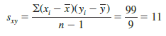 To measure the strength of the linear relationship between the number of commercials x and the sales volume y in the San Francisco electronics store problem, we use equation (3.13) to compute the sample covariance. The calculations in Table 3.7 show the computation of S(x – X)(yt – y). Note that X = 30/10 = 3 and y = 510/10 = 51. Using equation (3.13), we obtain a sample covariance of