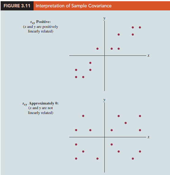 Referring again to Figure 3.10, we see that the scatter diagram for the San Francisco electronics store follows the pattern in the top panel of Figure 3.11. As we should expect, the value of the sample covariance indicates a positive linear relationship with sxy = 11.