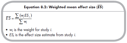 The weighted mean effect size across studies is computed from the weights (wj) and effect sizes (ESj) from each of the studies i using the following equation: